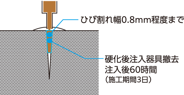特殊注入器具を用い、低圧で時間をかけてひび割れの奥深くまで接着剤を注入する工法。